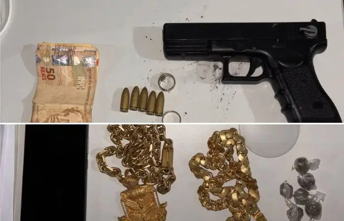 Além das substâncias, foi apreendido um simulacro de pistola, 5 munições de calibre 9mm intactas, R$ 210 em dinheiro e um celular de marca Samsung.